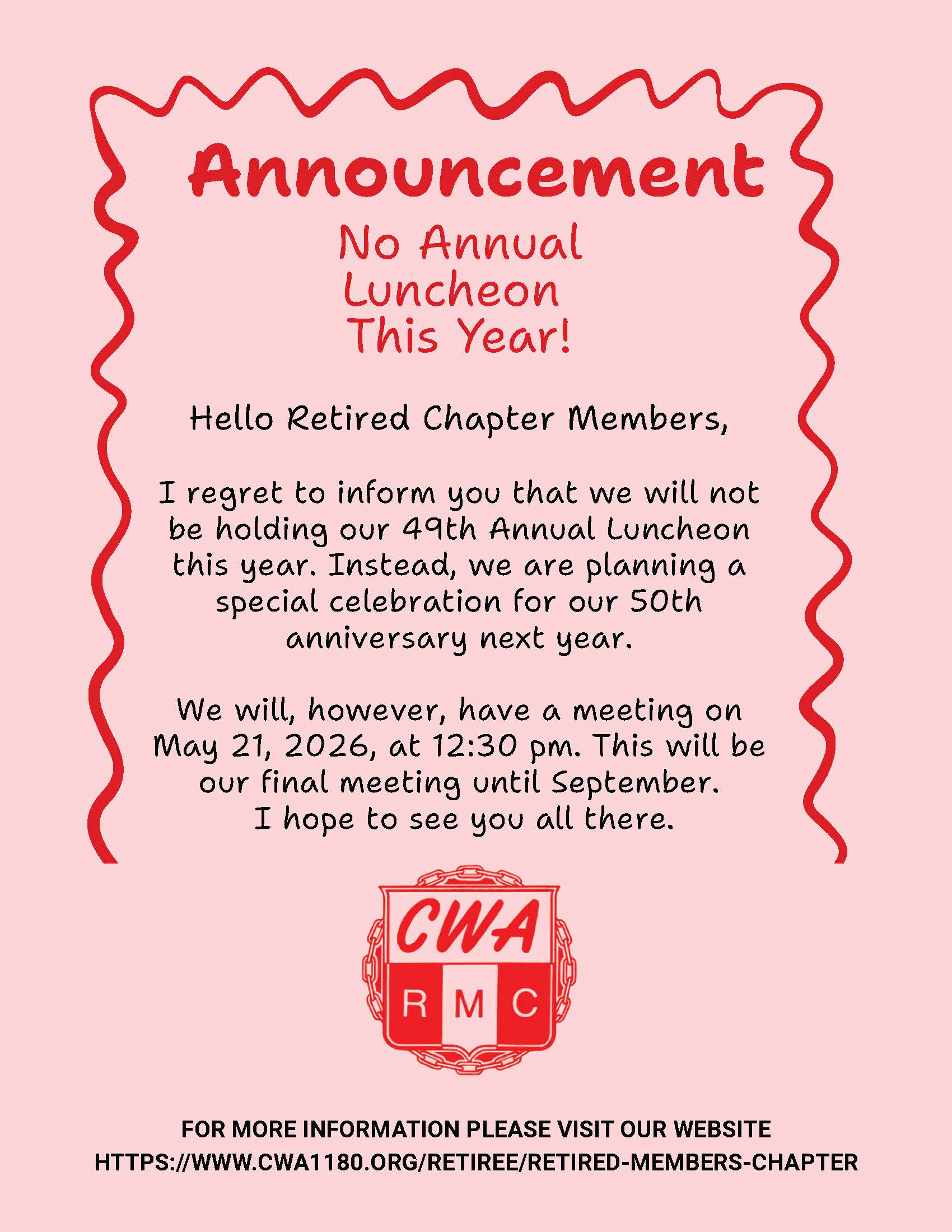 To join the Retired Members Chapter, please CLICK HERE to fill out the form. Once complete, send the form and your payment to: